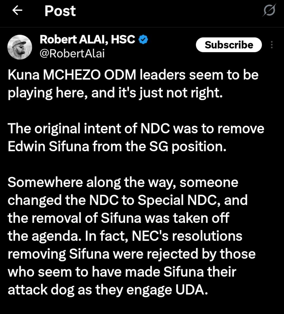 “Kuna MCHEZO ODM leaders seem to be playing here, and it’s just not right. The original intent of NDC was to remove Edwin Sifuna from the SG position,” Alai wrote.