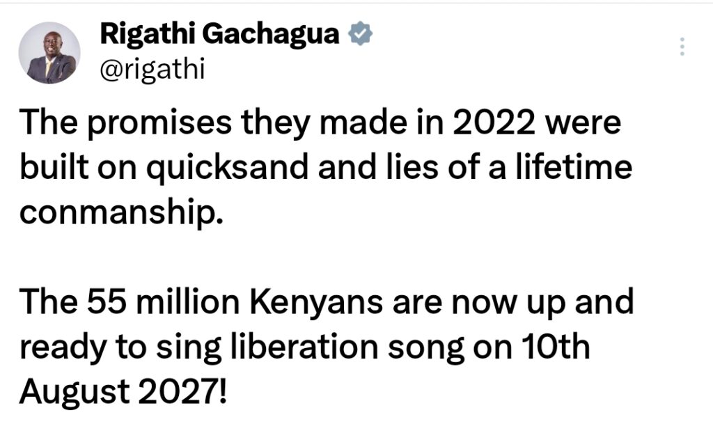 “The promises they made in 2022 were built on quicksand and lies of a lifetime conmanship. The 55 million Kenyans are now up and ready to sing a liberation song on 10th August 2027!” Gachagua said.